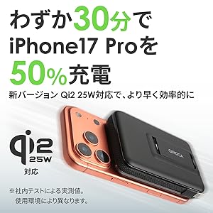最新のワイヤレス充電規格「Qi2(チー・ツー)」に対応しています 。 従来のワイヤレス充電は遅いのが欠点でしたが、Qi2対応により、有線充電に迫る効率と速度を実現しています。尚且つ「Qi2 25W対応」、これはワイヤレス充電の規格としての対応に加え、製品全体としての高出力性を指していると考えられます。一般的にQi2は最大15Wですが、これまでの7.5W充電に比べると倍の速度で充電可能です。